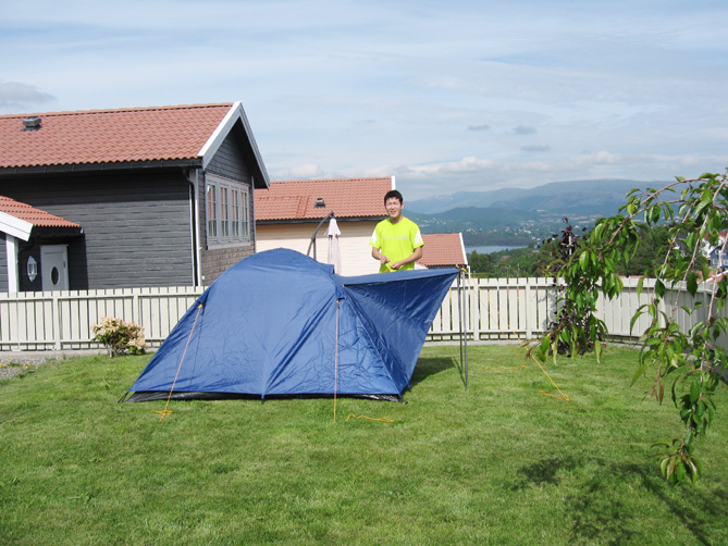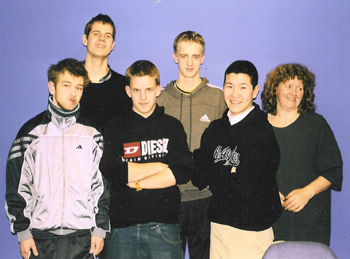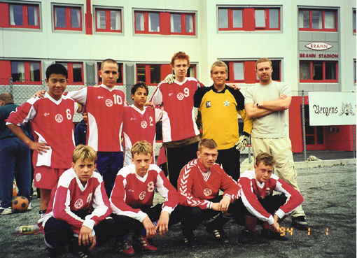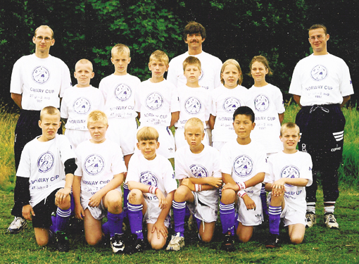 De to ungdommene med rød T-shirts blant alle gule: Norske Marius Wang Kalvenes Anda (17) og Øyvind Rød (17).