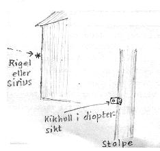 "For ca. 35 år siden kontrollerte jeg tiden i mitt lommeur ved hjelp av utvalgte fiksstjerner som slokkes ved hushjørnet på størst mulig avstand fra mitt øye ved en dioptersikte av et utklipt blikkstykke festet til annet hus eller en stolpe (se illustrasjon nedenfor). Neste dag slokkes den samme stjerne 3 min. 55.91 sek. senere (jeg husker ikke sikkert tallet). Jeg har notert en tabell med jevnt voksende tidsforandring fra den første til siste dag i måneden for lettere å beregne tiden før neste urkontroll noen eller flere dager senere.