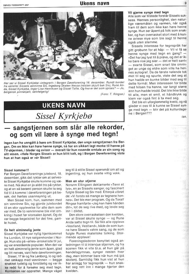 Fra julebord i Bergen Døveforening, desember 1986 Fra en av sidene i medlemsbladet Budstikken