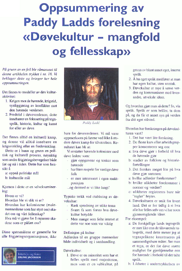 Han heter Paddy Ladd, og han har holdt forelesning under Døves Verdenskongress i Australia 1999.