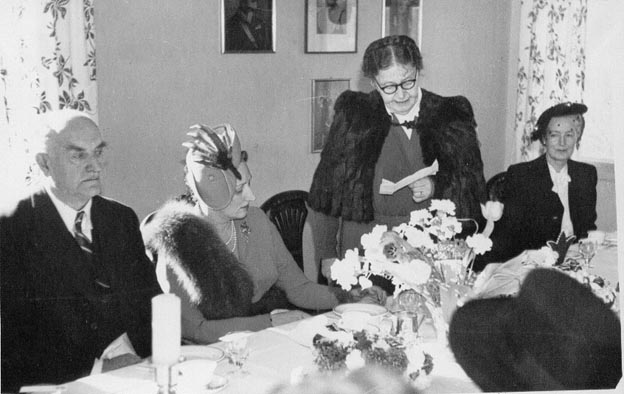 Fra venstre: Fabrikkeier Navn ? - kronprinsesse Märtha - Fru Inga Braae-Johannesen - Hoffdame til