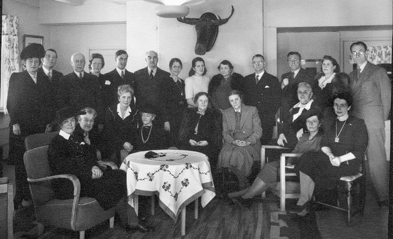 På bildet ser vi fru Braae-Johannessen i midten foran bordet og ved siden av henne til høyre er Direktøren for spesialskolene Marie