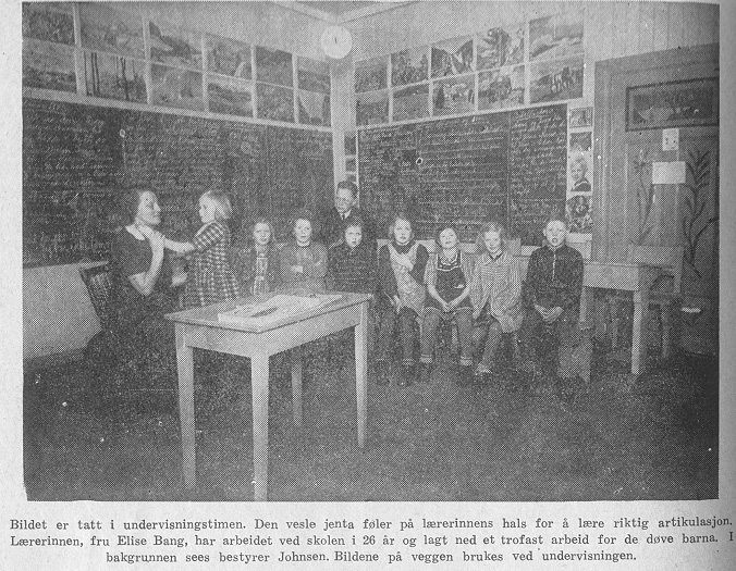 - Når de døve barna kommer på skolen, blir de født på ny, sa en gang en døveprest i Trondheim i et foredrag. Og det er riktig, - det store som hender dem er at de lærer å bli menneske. For det det først og fremst blir lagt vekt på ved døveskolene er språkundervisningen - artikulasjon, bruken av sin egen stemme som til da ikke har vært nyttet fordi barna ikke kan høre den, - og avlesing av de ordene de lærer fra lærernes munn. Når 7-åringen kommer på døveskolen, blir han tatt på fanget, og ved å se på lærerens munn og føle med hånden på muskelspillet og vibrasjonene i halsen hans, lærer den vesle gutten eller jenta de enkelte lydene og kan strålende si sitt første ord. Men så må en også lære hva ordet betyr - ved bilder eller tegninger - og hvordan det skrives.