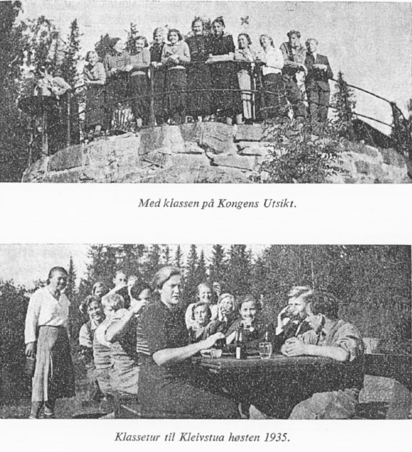 Samme år som frøken Bjørset fyller 80 år, kan vi også «feire» et annet jubileum. Det er nemlig nå akkurat 35 år siden vi hadde vår siste skoletur med henne. Den gangen var hun altså 45 år. Det var 3 strålende høstdager vi fikk oppleve under den minneverdige turen til Kleivstua. Etter bussturen fra Oslo, gikk vi av på Sundvolden. Høstsolen varmet såpass at vi fant oss en fin rasteplass for oss selv ved Steinfjorden, hvor vi spiste medbragt niste. Etterpå gikk vi oppover den bratte Krokkleiva. Den gangen fantes jo ikke den tønneheisen som nå for tiden besørger storparten av turisttrafikken opp til Kleivstua. Her gikk altså hovedferdselen med hest og karjol i gamle dager, og det var virkelig interessant å se hvordan en stelte med veibygging i gamle dager. Den gangen tok en også hensyn til den rette linjen mellom to punkter, men da gikk det temmelig mye opp og ned. Selvsagt var iv varme og svette da vi kom opp til den gamle skysstasjonen som heter Kleivstua. Der sto den gangen fremdeles den gamle hvitmalte hovedbygningen. Resten av dagen koste vi oss med forskjellige leker ute på den trivelige gardsplassen.