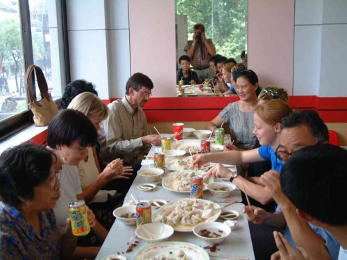 Alle spiste lunsj sammen på en kinesisk fastfood restaurant. Daddel- og lotuskjernesuppe og dumplings. Vi norske begynner å komme oss bra i å spise med pinner!