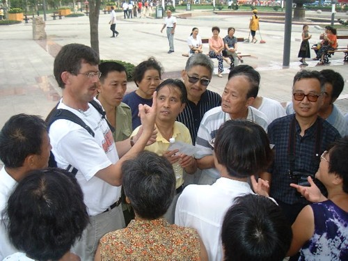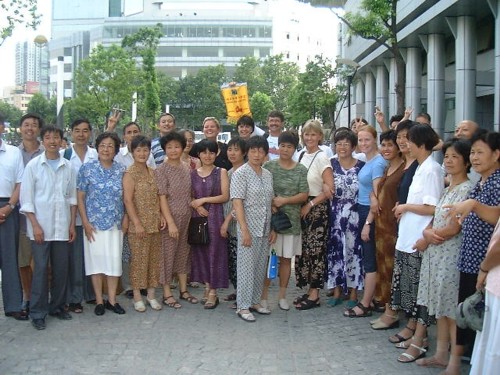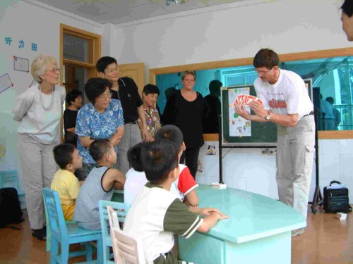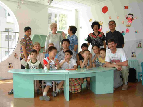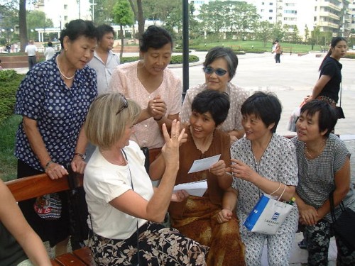 Døveforeningen her har ikke råd til å leie seg inn på et lokale, så de har 6 ulike plasser i byen hvor de møtes ute. I dag var samlingen på en åpen plass, og de var vel ca 70 –80 personer der. De fleste var pensjonister, men ikke så rart kanskje når pensjonsalderen er 50 år. Praten gikk livlig og mange tegn ble utvekslet på kinesisk og norsk tegnspråk. Veldig hyggelig! Vi mottok vimpelen fra døveforeningen i Nanjing under en liten sermoni.