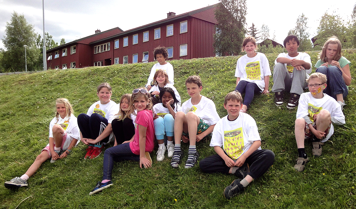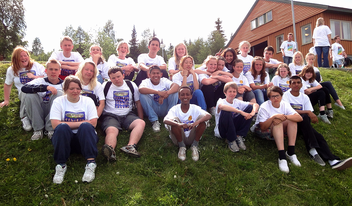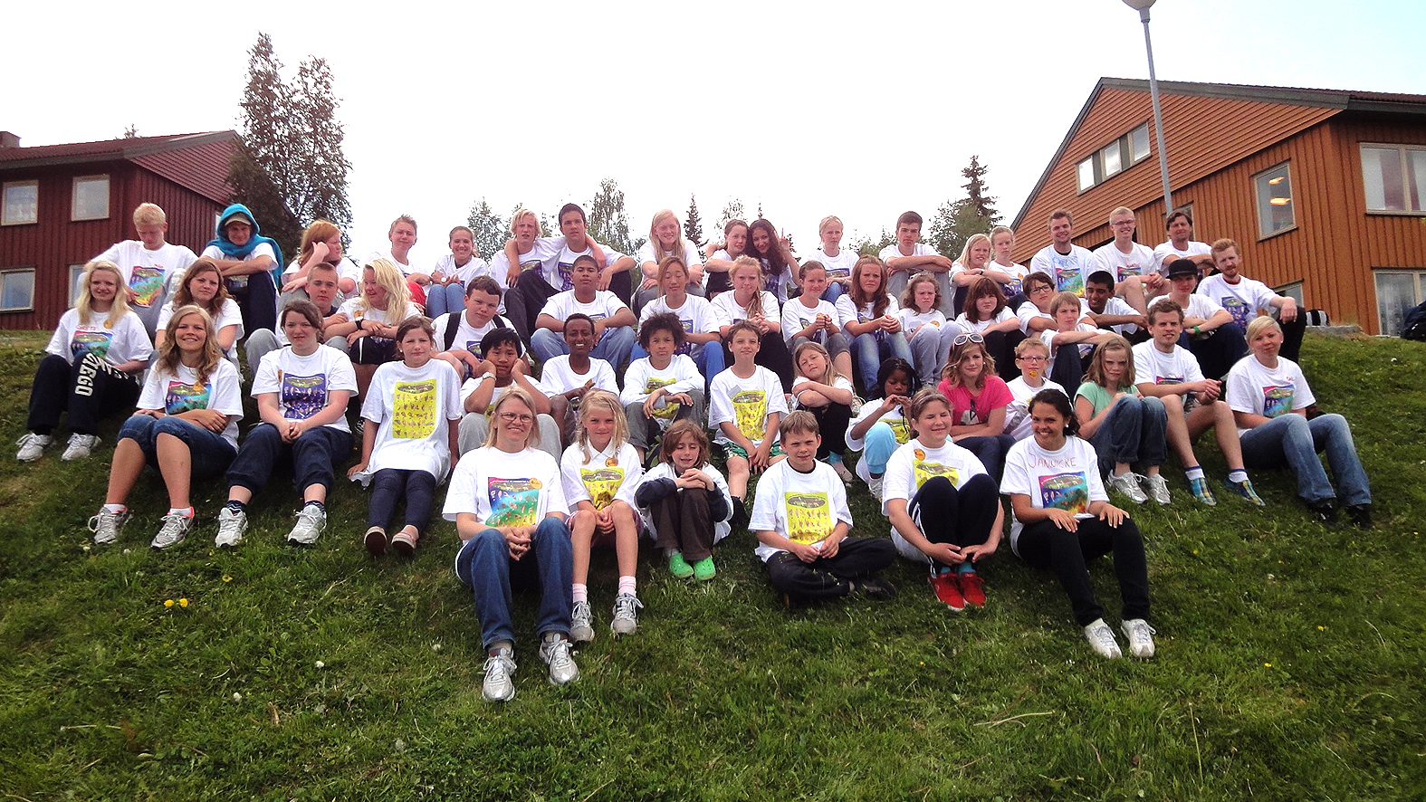 Barn 7-12 år med gul front på T-skjorter, 13-17 år med blå front på T-skjorter, samt ledere med flerfarget front på T-skjorter