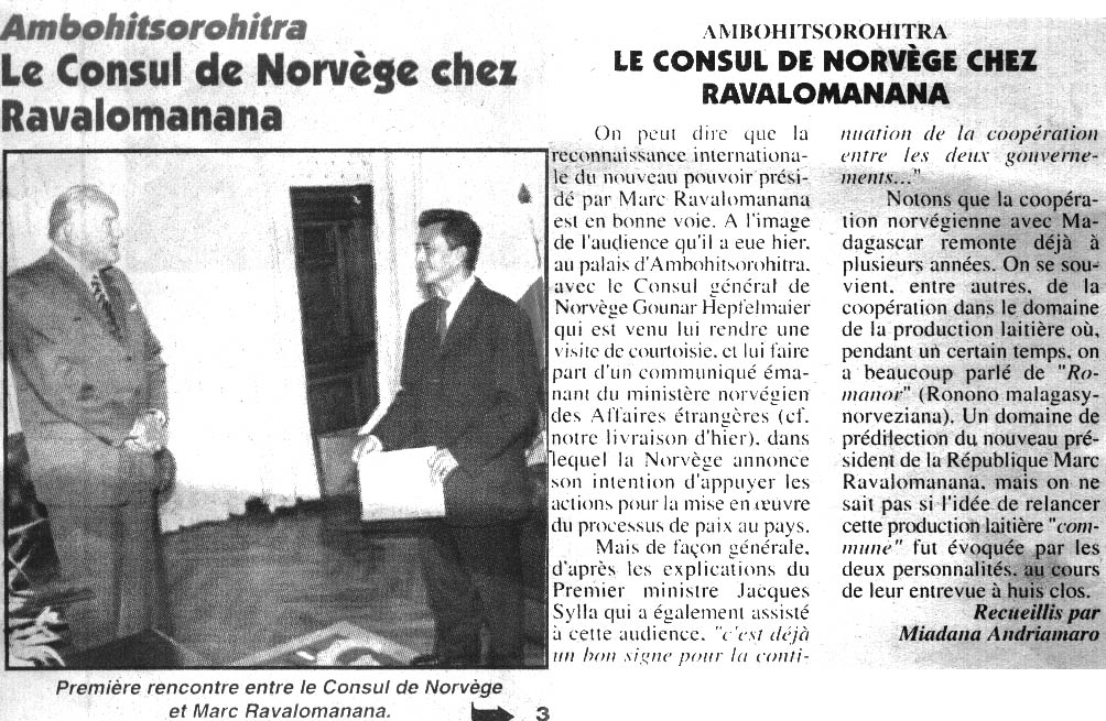 that Norwegian is ready to co-operate with Malagasy government. That is to say that Norwegian accept Mr. Marc Ravalomanana as
