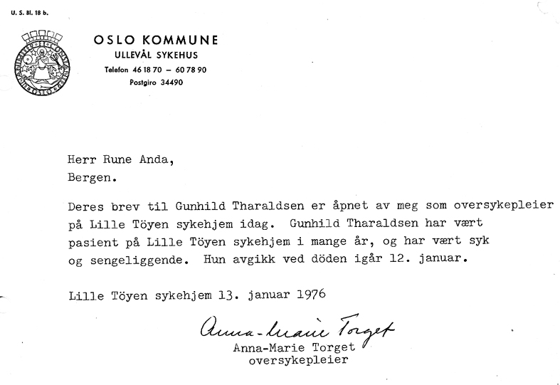 Melding om frk. Tharaldsens død